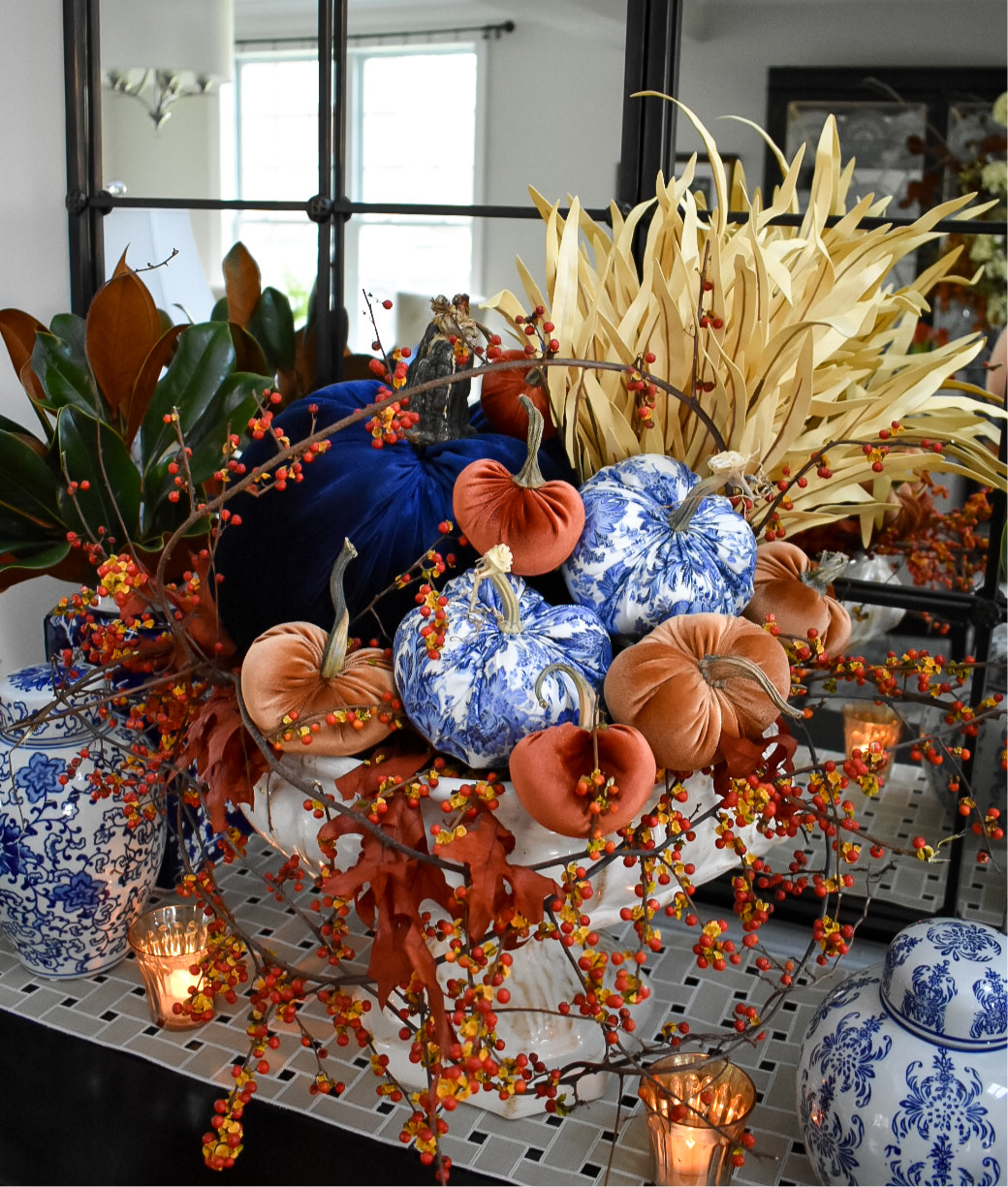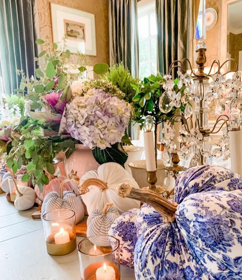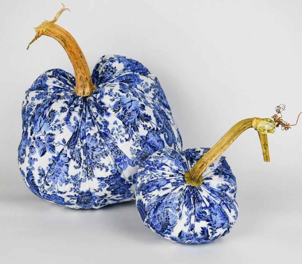 Gorgeous blue and white floral cotton fabric with silver accents. Each pumpkin is handmade and has a natural stem from Nebraska. Available in two sizes, sold separately.