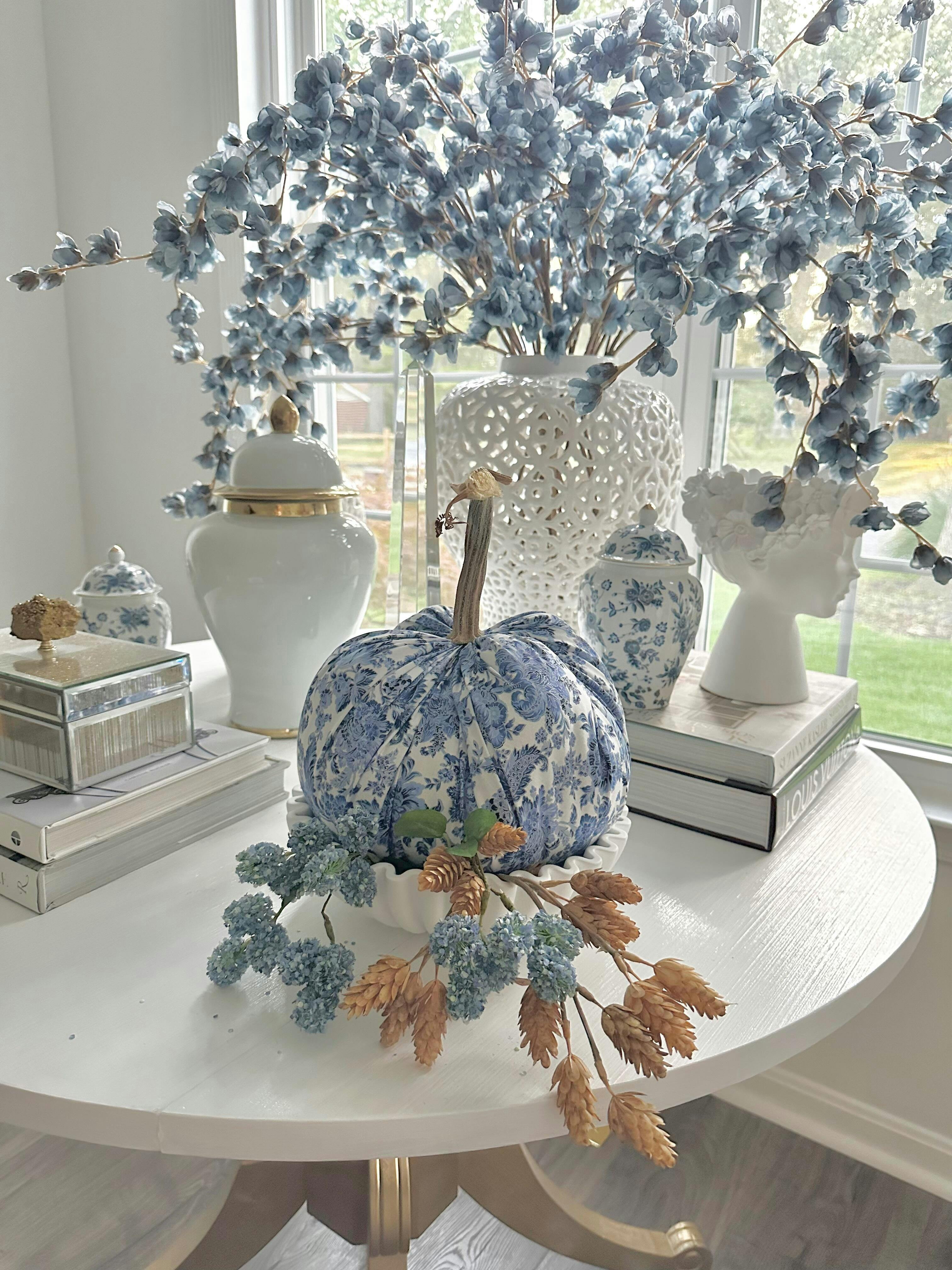 Gorgeous blue and white floral cotton fabric with silver accents. Each pumpkin is handmade and has a natural stem from Nebraska. Available in two sizes, sold separately.
