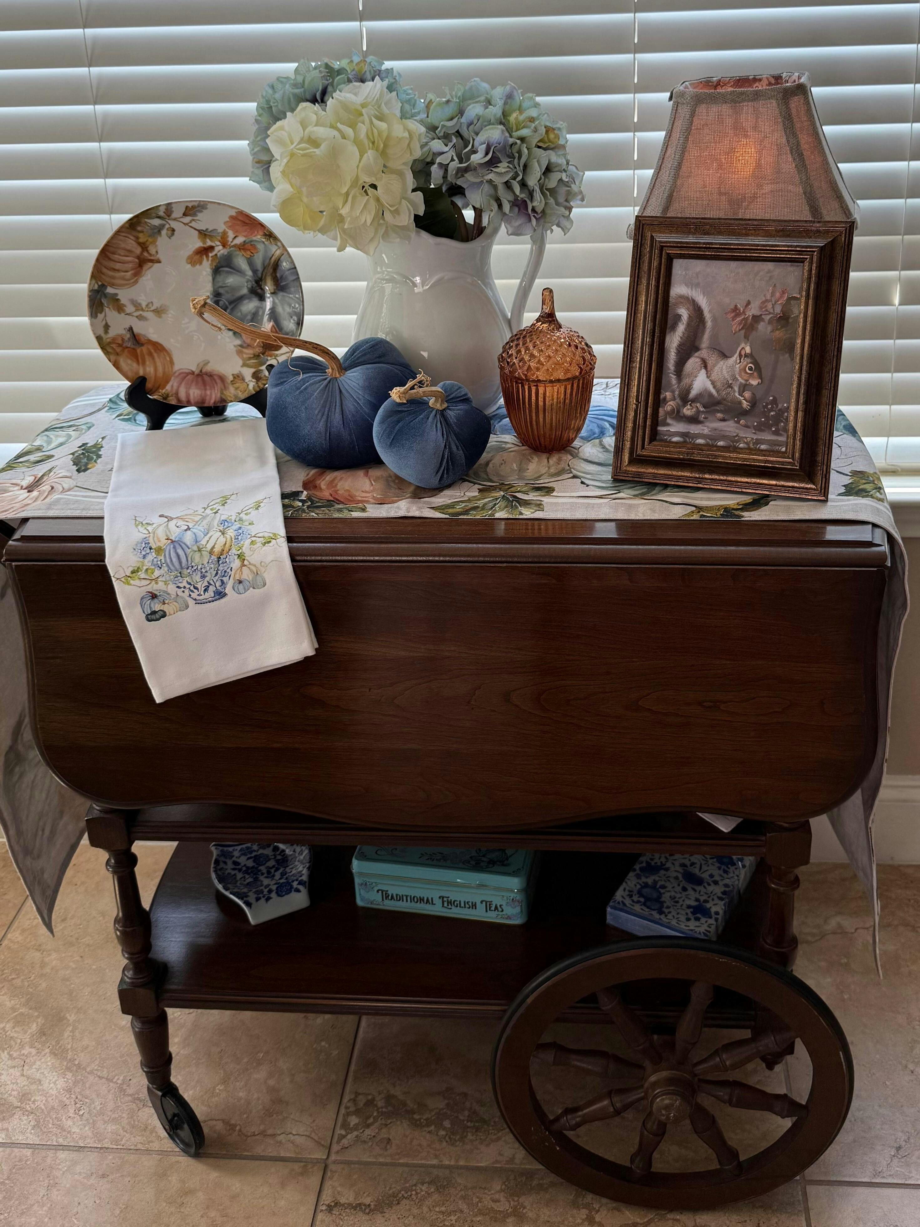 I just love the blue velvet pumpkins! I love decorating with blue and white and they looked so pretty on my antique tea cart.