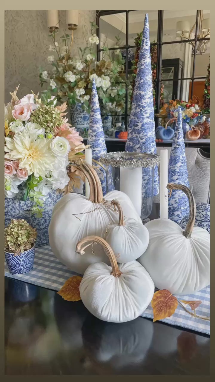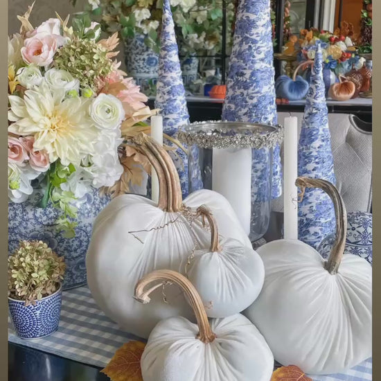 Please note due to the nature of the stretch velvet stretching more in one direction than the other, my velvet pumpkins are more oblong than round in shape. Personally I think this helps them fit on mantels and tables better.
