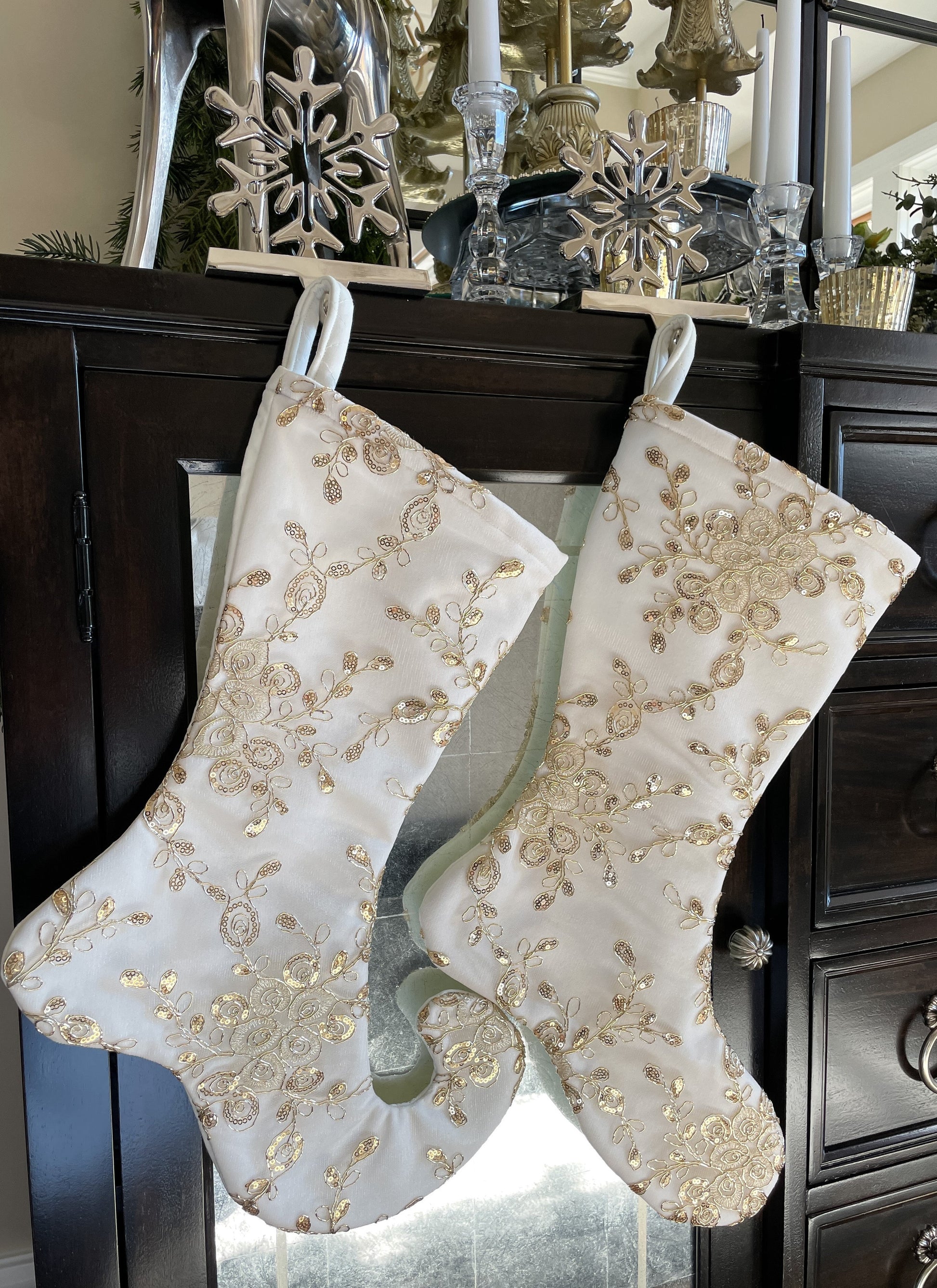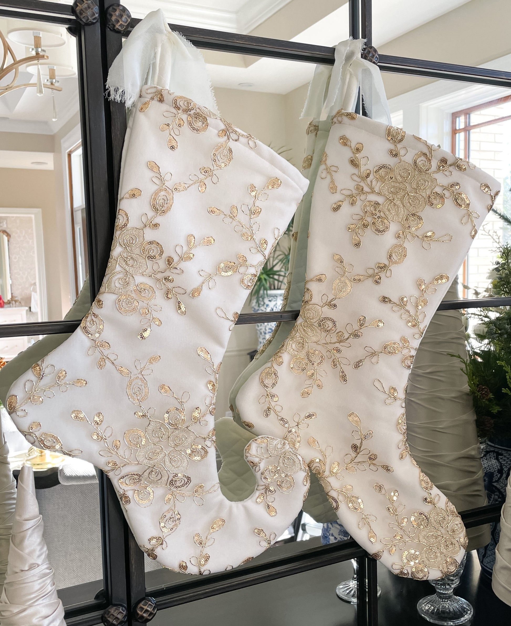 White Velvet Christmas Stocking with Gold Sequin Overlay